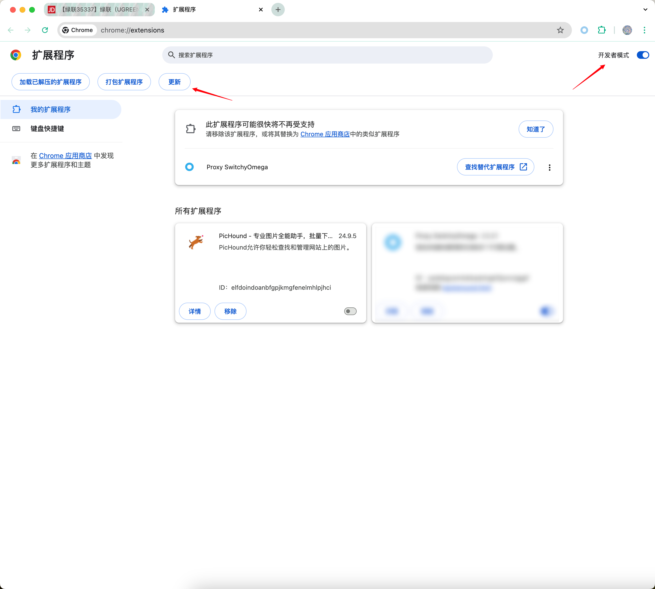 如果是在 webstore 中安装的插件,会自动进行更新,无需担心。若你需要手动更新,访问 “chrome://extensions/“,打开开发者模式,然后点击 “更新” 按钮。